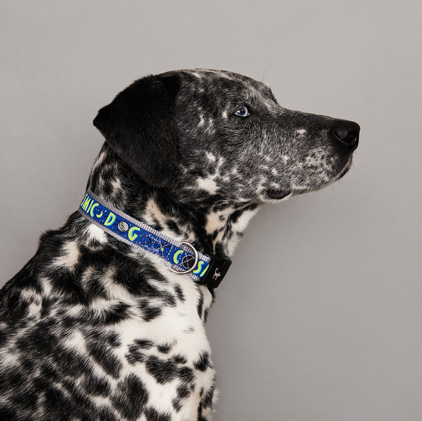 For explorer dogs, dreamer dogs, furry aliens from other galaxies, and all cosmically beautiful dogs! Collar with the inscription COSMIC DOG and the constellation Canis Major, which includes the brightest star in the sky - Sirius. Neon colors, silver thread embroidery.